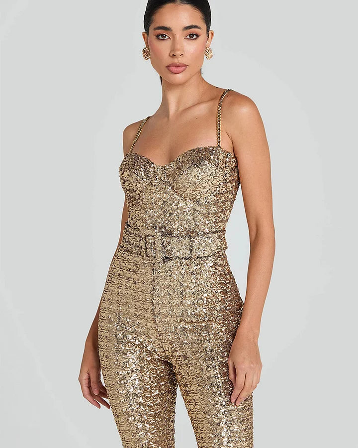 Este mono de lentejuelas presenta tirantes finos, escote corazón, pantalones acampanados y un cinturón ancho. Su diseño de lentejuelas crea un look glamuroso y llamativo, perfecto para fiestas o eventos formales, con un brillo intenso y un encanto retro.