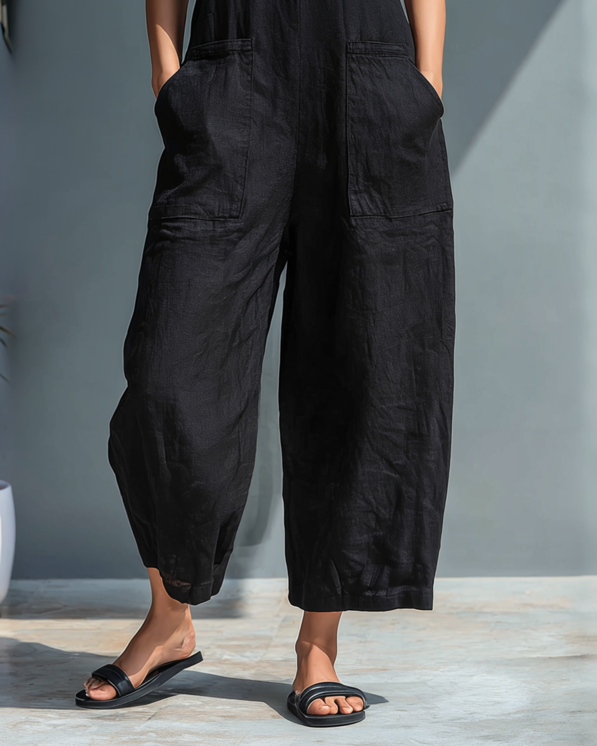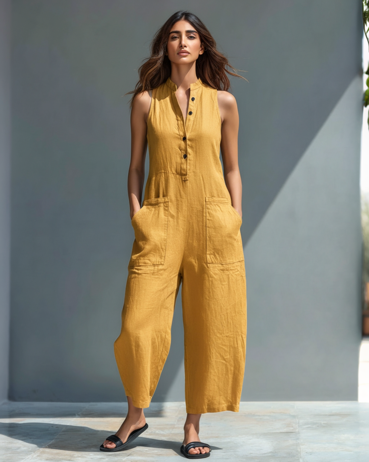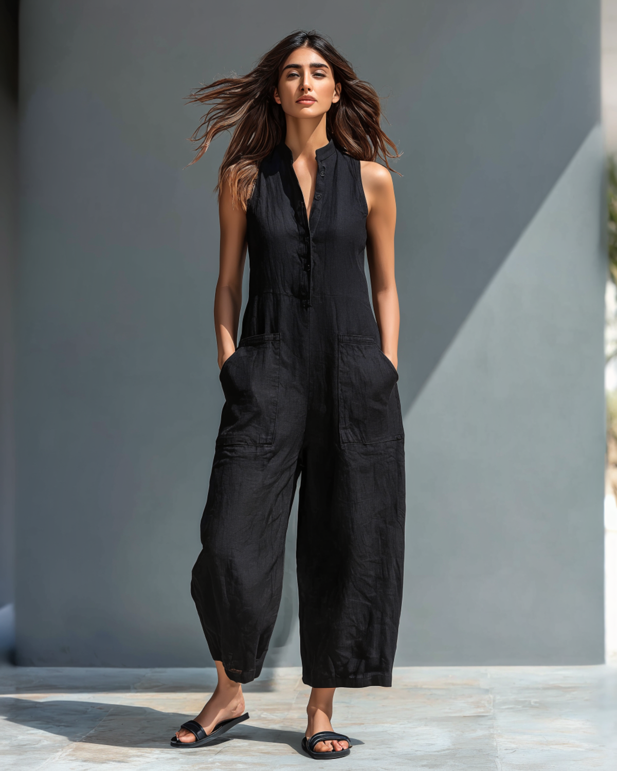 Un mono minimalista confeccionado en una ligera y transpirable mezcla de lino. Su cierre frontal de botones y el cuello mao aportan un toque refinado, mientras que la silueta holgada y el diseño sin mangas crean una caída fluida y sofisticada, ideal para un estilo elegante y relajado.